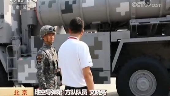 地空导弹第1方队队员 文晓亮:咱们这个红-9B导弹是采用冷弹垂直发射技术,导弹出筒后可以在360度范围内,任意方向上实现快速转弯,不会出现发射死区,它可以抗击集群突击不同方向的来袭目标,包括强击机、歼击机、轰炸机、武装直升机、并且具有一定的反导能力。